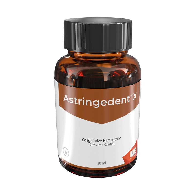 La solution hémostatique Astringedent X est une solution aqueuse ferrique à 12,7 % qui agit rapidement pour arrêter les saignements compliqués. Elle contient des proportions équivalentes de sulfate ferrique et de subsulfate ferrique. Remarque : la solution hémostatique Astringedent X diluée n'est pas l'équivalent de ViscoStat ni des solutions hémostatiques Astringedent.