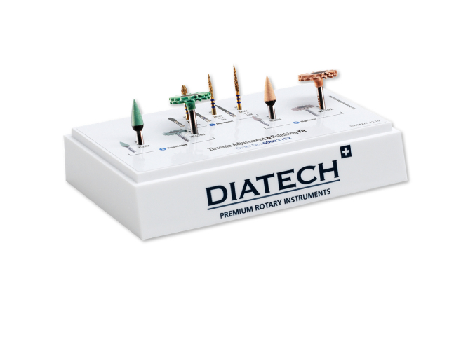Ce kit contient tout le nécessaire pour l'ajustement, le polissage préalable et le polissage extra-fin de la zircone et des autres céramiques à hautes performances.