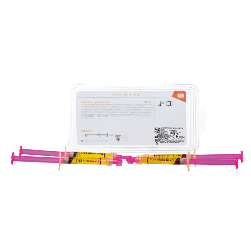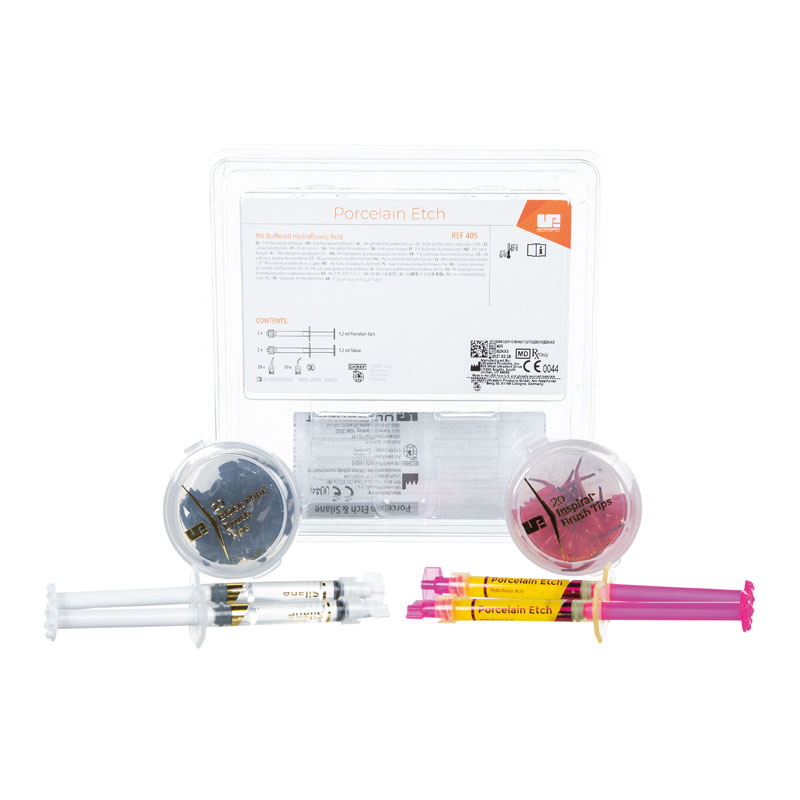 Le Kit contient 2 seringues de 1,2 ml (1,33 g) de Porcelain Etch + 2 seringues de 1,2 ml (0,96 g) de Silane + 20 embouts Black Mini Brush Tips + 20 embouts Inspiral Brush Tips.