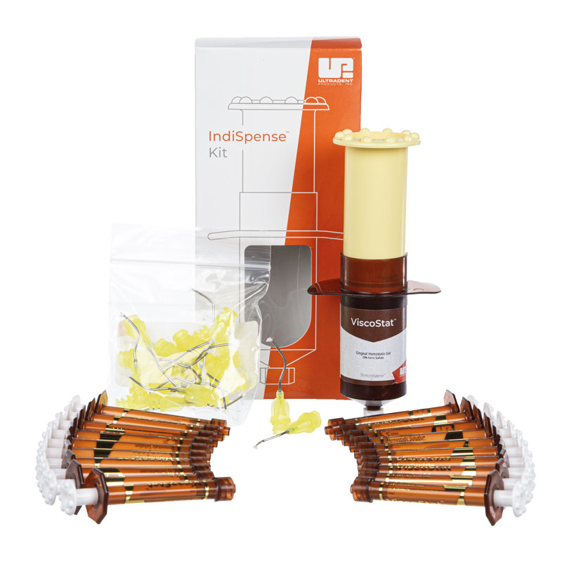 Gel hémostatique à base de sulfate ferrique à 20 %. Sa viscosité garantit une coagulation instantanée. Il crée une préparation propre et sèche pour une prise d’empreintes avec n’importe quel matériau ou technique. Le gel ne coule pas et ne s’affaisse pas, permettant une application sélective. Il peut être utilisé comme alternative au formocrésol dans les pulpotomies. Tamponné avec des adjuvants brevetés, il offre une douceur incomparable pour les tissus mous et durs. Dispositif médical de classe I. Fabricant Ultradent Inc. Le Dental-Infusor kit : 1 seringue IndiSpense de 30 ml (36,69 g), 20 Metal Dento-Infusor Tips et 20 seringues vides de 1,2 ml.